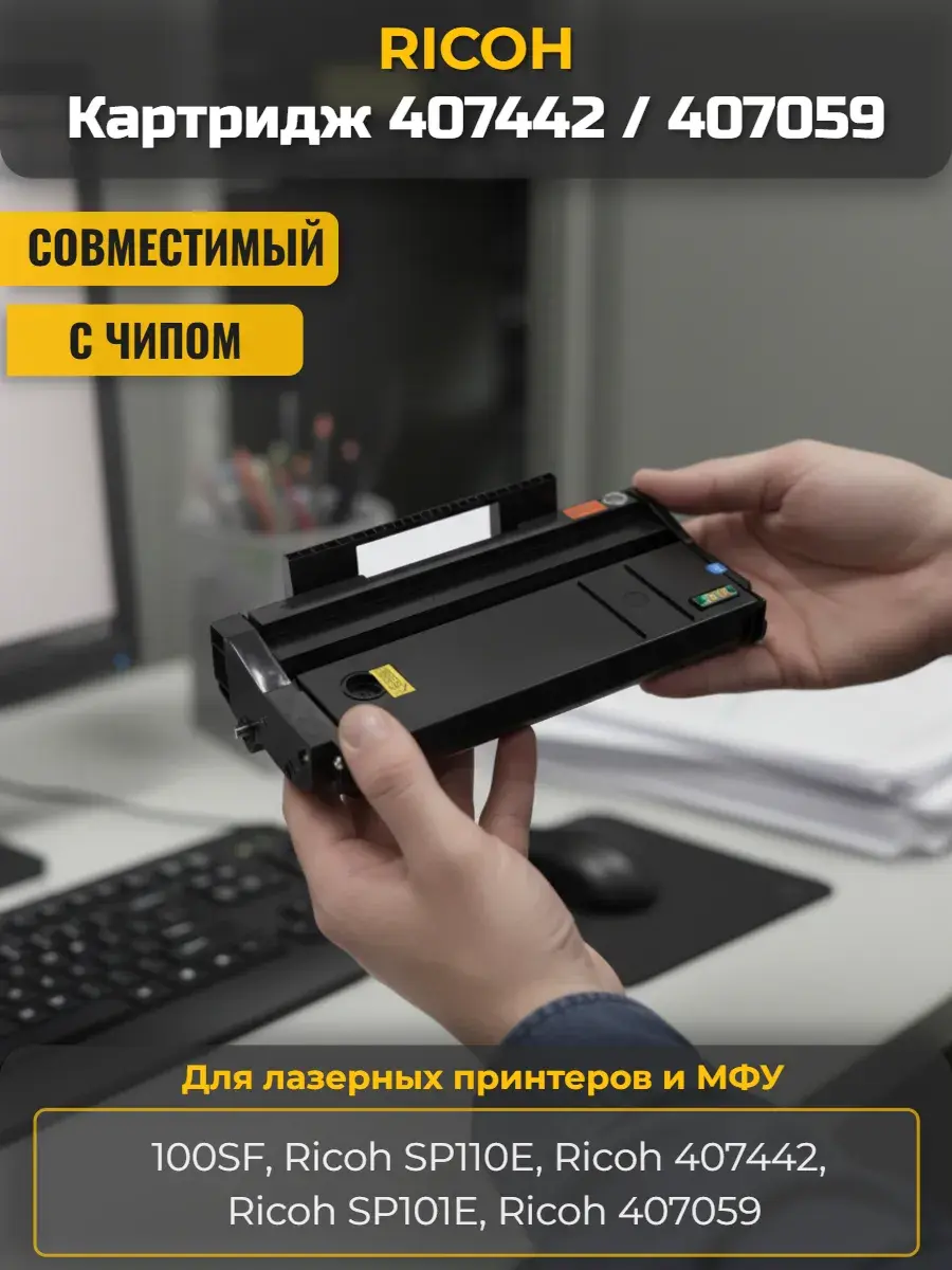 Полностью совместим с моделями Ricoh 100SF, Ricoh SP110E, Ricoh 407442, Ricoh SP101E, Ricoh 407059.